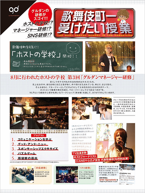 ホストの接客技術の研修ですが、接客業に携わる方々や、飲食店様、小売店様、サービス業といった業種など、一般の方々にもご参加いただける内容となっております。歌舞伎町の活性化を目指し、30年間トップを走り続けるTOP DANDYの経営方針等もお話いたします。